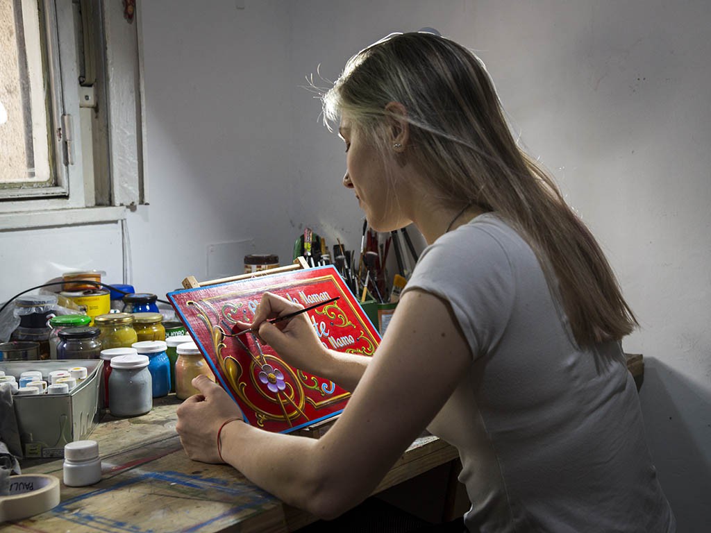 Por: Gabriela Sánchez.“Yo tuve que hacer un cartelito con mi nombre, lo hice con acuarelas como pude y quedé re fascinada porque además tenía que buscar imágenes, preguntar un poco qué era. Después, me quedaron las ganas de aprender.” Tan fuerte fue ese deseo que, según sus propias palabras, empezó “a volver loca” a toda su familia. “Yo iba y le decía a mi mamá: `Quiero aprender a filetear´ y era como: ‘¿Dónde?’ Como que no había lugares. Un día fui a una librería y encontré una revista que tenía algo de filete y la compré, compraba lo que encontraba básicamente”, recordó la artista de 27 años que tiene su taller en Morón.