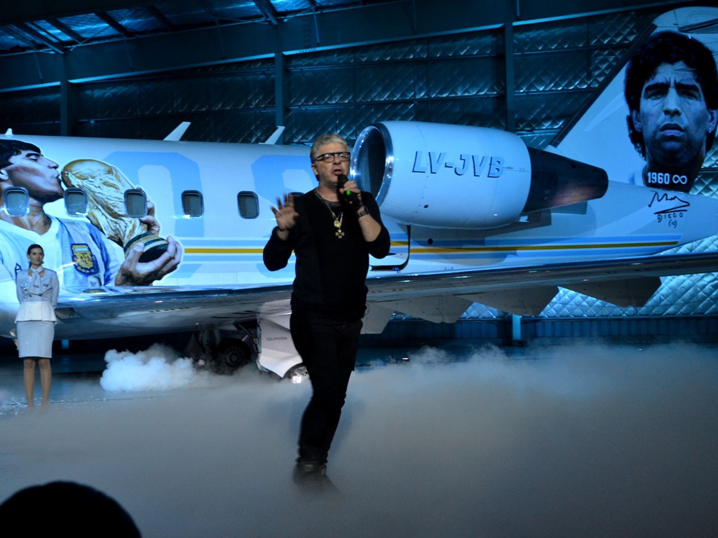 En los hangares de la empresa aeronáutica Global Jet, se realizó la presentación del avión en un evento en el que no faltaron famosos, deportistas, periodistas especializados y más de 400 invitados. Con la conducción de Juan Pablo Sorín, histórico capitán de la Selección Argentina a fines de los noventa, y la periodista Agustina Casanova, se lanzó lo que será un homenaje aéreo a Maradona que recorrerá el globo hasta llegar a Qatar y en el que volarán algunos de los jugadores Campeones del Mundial 86. Por iniciativa de la firma Give and Get, liderada por su CEO, Gastón Kolker, el artista plástico Maximiliano Bagnasco intervino un lujoso Bombardier Challenger con la imagen del Diego besando la copa del mundo.