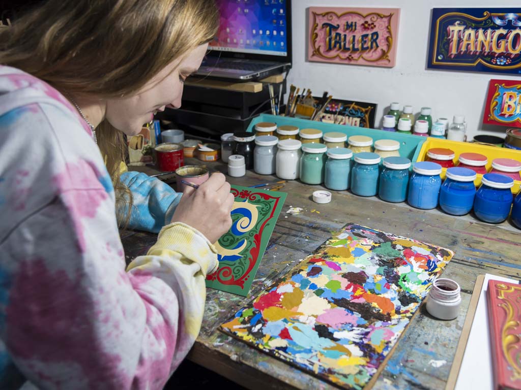 Por: Gabriel Colonna, Leandro Fernández Vivas.El taller de Paula Di Pietro está gobernado por los colores. La fileteadora porteña, pero de Morón, mueve apenas su pincel para darle un retoque a su última pieza. La celeste y blanco es ineludible, dispara la alegría de los curiosos que, cámara en mano, miran el momento de creación. El mate está listo, Messi está donde debe estar.