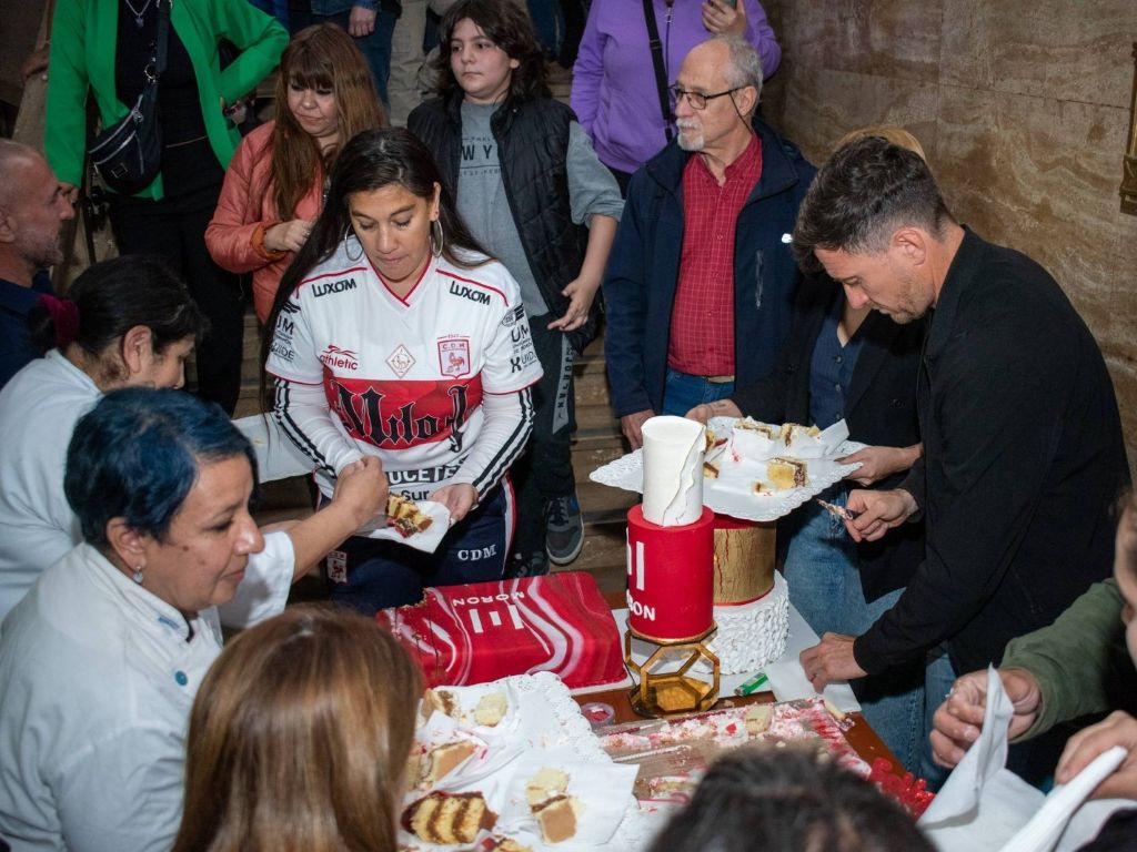 El tradicional corte de torta estuvo a cargo del intendente Lucas Ghi, junto a estudiantes del Centro Municipal de Gastronomía, el Instituto IMES y otros espacios de formación del distrito, quienes elaboraron la pieza especialmente para la ocasión.