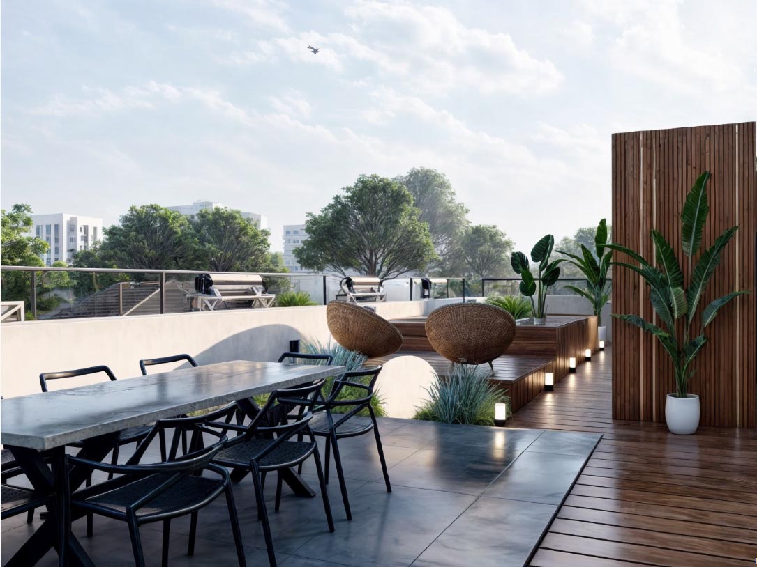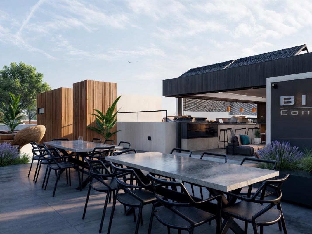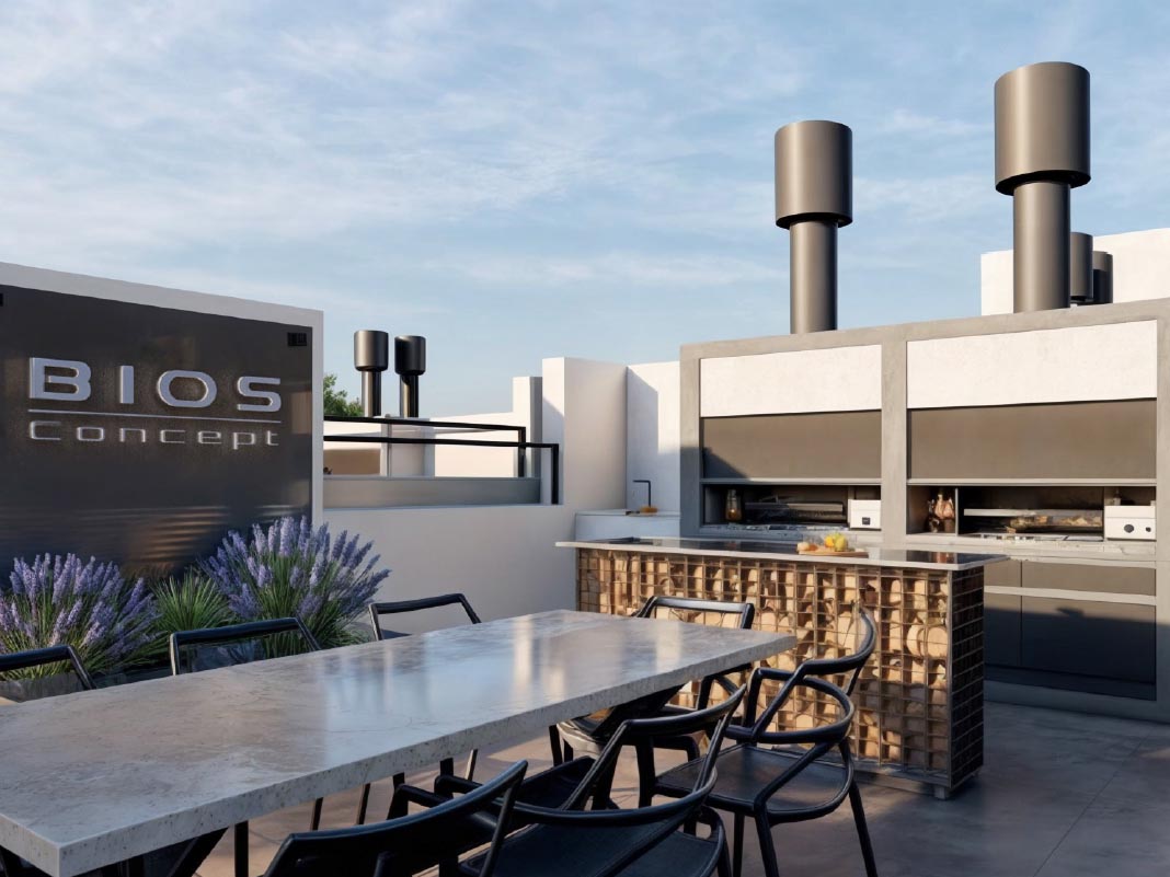 En los espacios comunes, BIOS Concept suma gimnasio, coworking, bicicleteros, terrazas con parrillas y mini piscina, además de cocheras con posibilidad de carga para autos eléctricos. El uso de energía solar para sectores comunes forma parte de la estrategia de eficiencia energética del edificio.